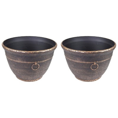 A unique and functional lawn storage/garden hose container reel keeps hose organized patina finish gives appearance of cast bronze sculpted detail for natural look holds 100' (30,48m) of 5/8 (1,59cm) garden hose lid hinges or lifts off anchoring system secures hose hider emsco group.